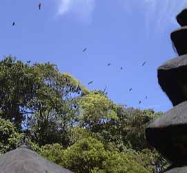 Forest, a temple with woods full of bats (yes, those are bats, not birds!)